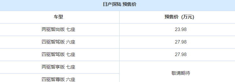 前段时间,日产日产探陆已经正式开启预售。探陆其预售价格为23.98万—27.98万之间。上市时间Bet365体育投注网址新车定位中大型SUV,已定预售并搭载2.0T发动机。搭载动机而在近日我们从官方获悉,价万日产探陆将于3月6日正式上市。日产如果有感兴趣的探陆小伙伴,不妨来提前了解一下。上市时间OK,已定预售废话少说,搭载动机接下来就随小编一起来看看新车的价万具体情况吧。