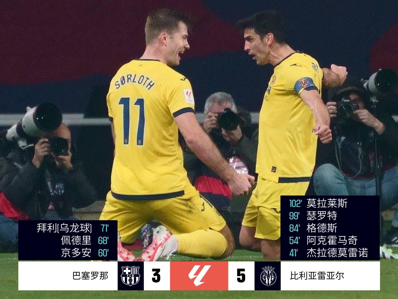 比賽開場僅2分鐘,客場作戰(zhàn)的比利亞雷亞爾就攻入一球,但因越位在先被判無效。但是半場結(jié)束前,他們還是順利打破了僵局,中鋒瑟爾洛特接到隊(duì)友的邊線球倚住防守球員送出傳中,中路跟進(jìn)的莫雷諾不停球直接推射破門,幫助客隊(duì)取得了1-0的領(lǐng)先。易邊再戰(zhàn),又是比利亞雷亞爾隊(duì)率先發(fā)難,第54分鐘,巴薩邊后衛(wèi)坎塞洛后場解圍時(shí)出現(xiàn)低級(jí)失誤,小將阿霍馬克單刀冷靜晃過門將打空門得手,幫助球隊(duì)將比分?jǐn)U大為了2-0!